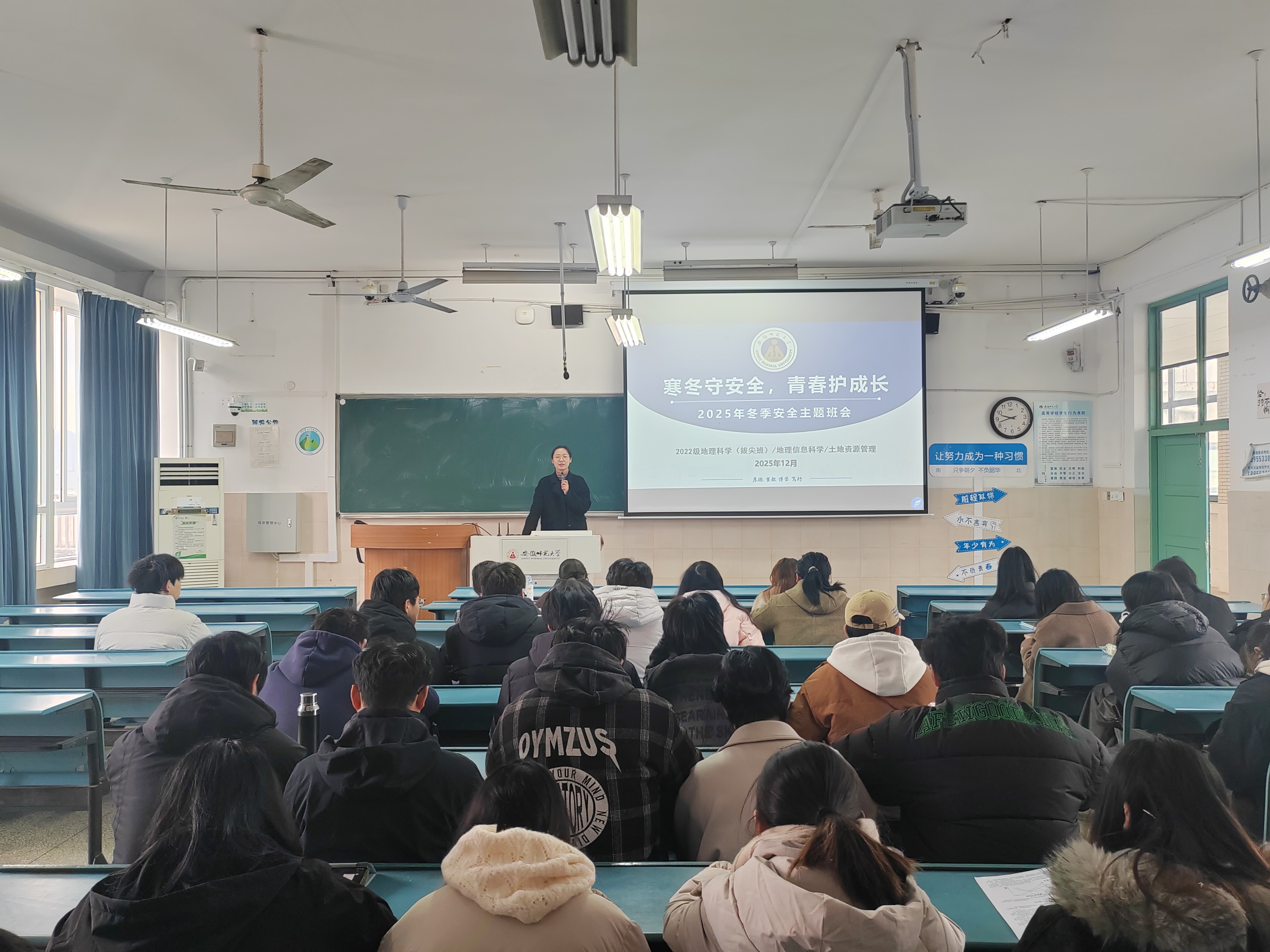 为增强学生冬季安全意识,筑牢校园安全防线,近日,2022级地理科学(拔尖班)、地理信息科学、土地资源管理专业于行知楼4号教学楼召开“寒冬守安全,青春护成长”冬季安全教育主题班会。班会由辅导员陈祥云主讲。