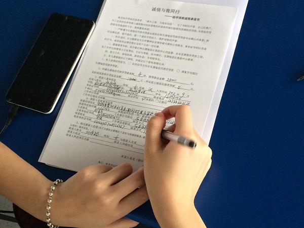 5月25日下午,观看完诚信宣传片的毕业生们在承诺书上填写上自己的信息、签上自己姓名。立下承诺鞭策自己要诚信还贷,学会感恩社会,不断成长。受资助之力,顺利完成学业,以诚信和努力回报社会。