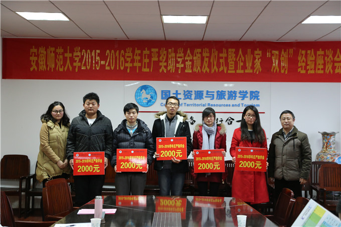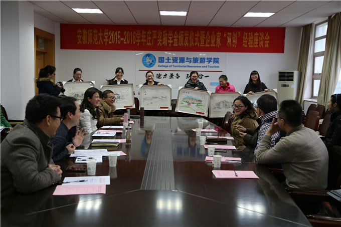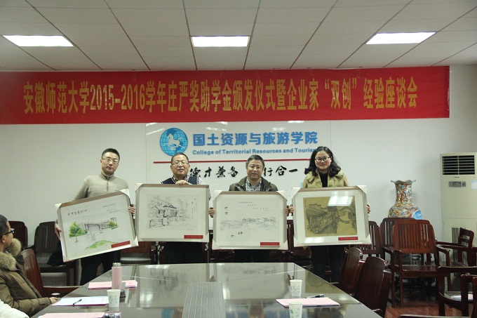 会议伊始,乔静首先代表学院对庄严基金会各位代表的到来表示热烈欢迎,并详细回顾和介绍了庄严基金会在我校国旅学院设立和发展情况。接着,焦华富在致辞中表示,奖助学金的颁发不是简单的物质资助,更是精神的传递,希望同学们能增强社会责任感,学会传递爱心,要将这种信念内化于心、外化于行;他还勉励受助同学要自强不息,勤奋学习,回报社会;激励同学们要向企业家学习,从企业家身上吸取勇于创新、坚持到底的精神力量。庄严基金会代表赵泉陈先生高度肯定了我校资助工作的规范性和时效性,认为本次座谈会以“双创”为主题使得颁发仪式更有意义,他鼓励受助同学要正确看待眼前的困难,不断努力,刻苦钻研,坚持梦想,抓住机遇,人生一定会取得收获。基金会代表吴斌宣读了2015-2016学年庄严奖助学金颁发决定,与会代表共同为受助学生颁奖。随后,城乡规划专业受助学生向基金会代表赠送了亲手绘制的作品——《美丽师大十景图》。