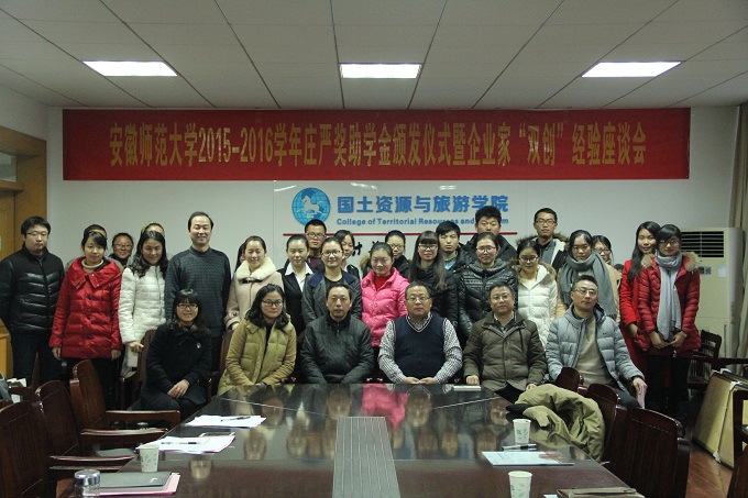 2015-2016学年庄严奖助学金颁发仪式暨企业家“双创”经验座谈会在国旅学院行政楼三楼会议室举行。庄严基金会评审委员会委员赵泉陈、吴军、吴斌,秘书长杨晶晶,国旅学院院长焦华富,党委副书记乔静及学院全体专兼职辅导员、获奖受助学生参加了会议,会议由乔静主持。