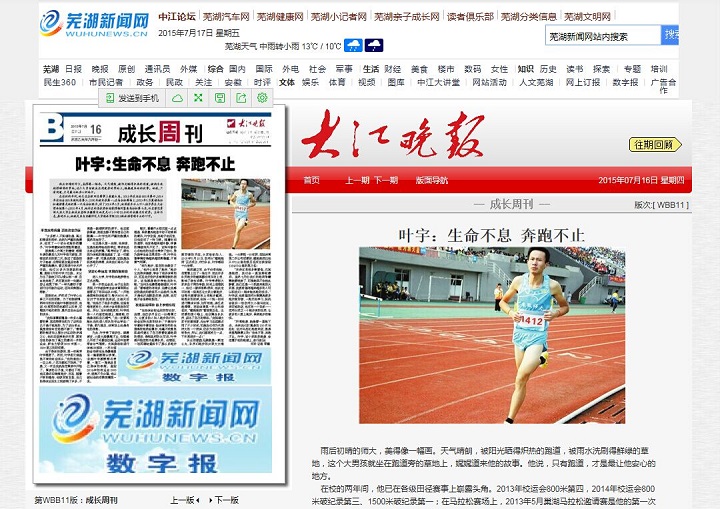 (本网讯 国旅学院)7月16日,《大江晚报》刊登题为《叶宇:生命不息 奔跑不止》的文章,整版报道了国产精品