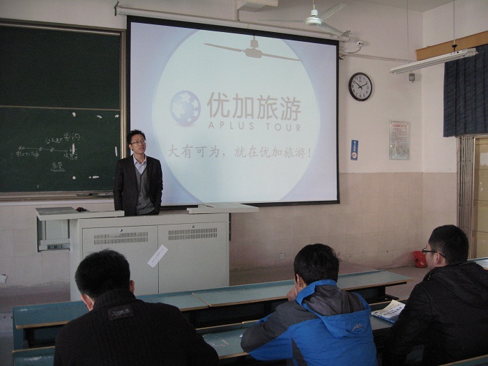 在招聘会现场,胡晓健先生首先重点介绍了优加旅游的企业成长、业务份额、文化氛围及招聘需求;同时他指出,作为综合类出境旅游供应商,优加旅游已经成为国内欧洲旅游十大批发商之一,也是目前发展最快的同类实体企业,因此各类人才需求量极大。胡晓健先生还就个人的成长经历、业界的发展前景,为同学们做了深度分析与分享,坚定有志于进入旅行社行业发展的同学们的决心,现场反馈热络,应聘同学众多。