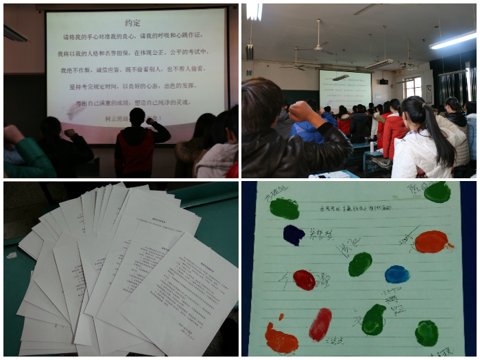 签名宣誓 立德树人践承诺。学院各班级在传达学校学院诚信考试精神的基础上,为实现本班“零违纪”的目标,也自发组织了形式多样的诚信考试教育活动,如撰写宣誓词《约定》,带领学生进行诚信考试宣誓;制作诚信考试黑板报、手抄报、条幅,全体学生郑重签名,对自己、班级、学院、学校说出承诺,践行诚信考试,书写诚信档案。