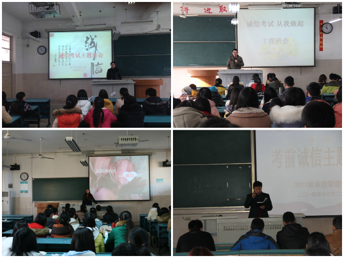 主题班会 全体师生齐动员。为进一步做好考风考纪教育工作,规范学生考试行为,国旅学院各年级各专业在辅导员的主持下召开了以诚信考试为主题的班会,切实做到宣传发动全覆盖,从不同视角分析了诚信考试的重要性,以及违反考试纪律所带来后果的严重性;同时,也引导学生积极备考,做好充分的复习准备,自信面对考试,收获满意的期末答卷和人生的诚信考卷。