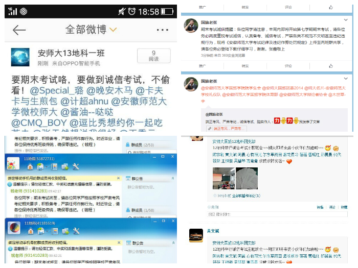 微微互动 线上线下说诚信。为在全院范围内营造积极备考、诚信考试的氛围,各年级辅导员、学生骨干等充分利用微博、微信、飞信等新媒体平台,撰写诚信考试箴言,分享复习备考经验,公示违纪考试案例,发布最新考务信息。学院充分利用在线新媒体平台,结合线下诚信考试教育活动,在全院范围内树立了诚信考试、公平竞争的良好风气。