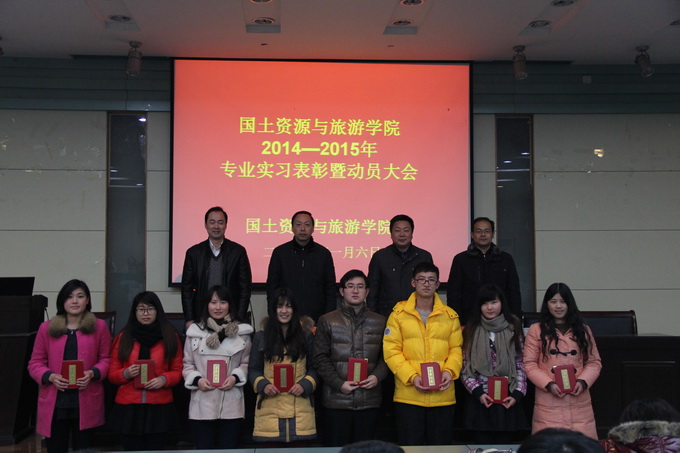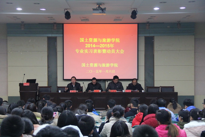 在实验楼101教室举行了2014—2015学年专业实习表彰暨动员大会,大会由院党委副书记乔静主持,院党委书记吴春雷、院长焦华富、副院长卢松、各专业实习指导教师、辅导员老师、11级优秀实习生代表和12级全体同学参加了此次动员大会。