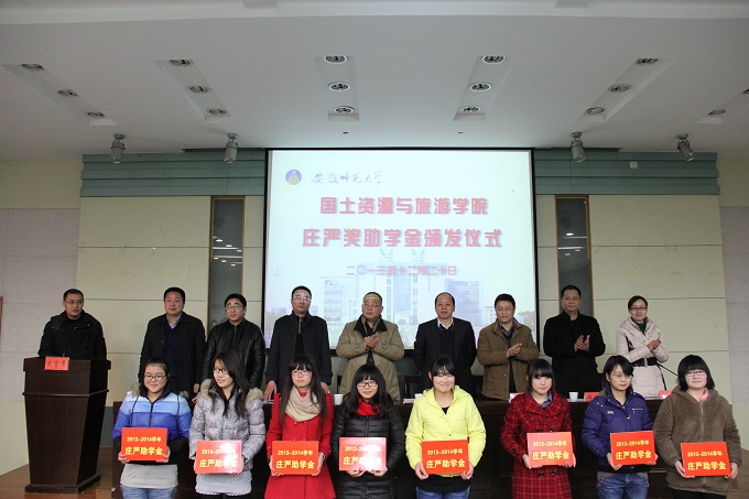 庄严奖、助学金自2008年起由安徽芜湖庄严基金会捐资设立,旨在通过奖励和资助的方式,帮助贫困大学生解决学习、生活上的困难,使他们能够励志成才,顺利完成学业。成立至今6年的时间里,庄严奖、助学金累计资助金额达75万元,资助同学810人次,为诸多大学生缓解了生活、学习问题,是国旅学院募集社会化助学基金中设立时间最长、奖助金额最大、覆盖面最广的一项奖助学金。