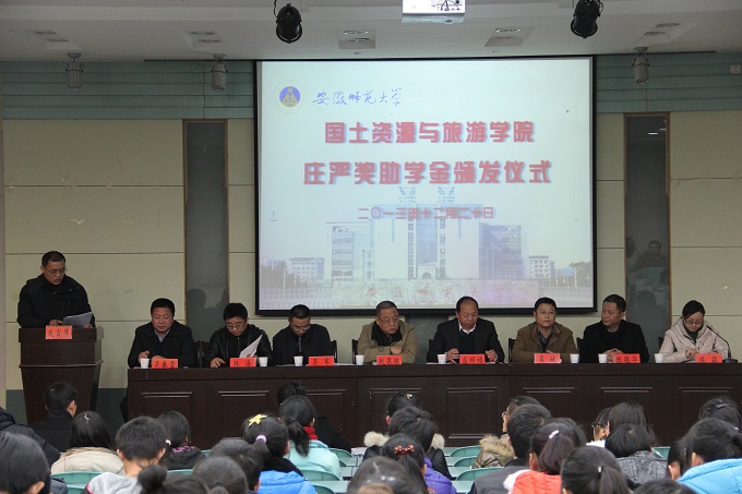 本网讯(院记者团)12月20日下午,我校第二届(2013-2014学年)庄严奖、助学金颁发仪式在国旅学院实验楼101报告厅隆重举行。庄严基金会代表、学生处副处长陈莉、院领导班子成员,学院全体辅导员及受奖、助学生代表参与了此次颁发仪式。大会由国旅学院党委副书记罗振主持。