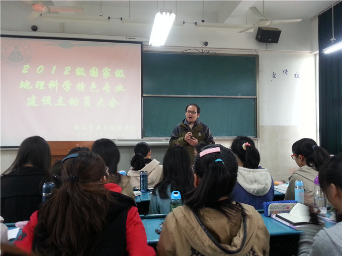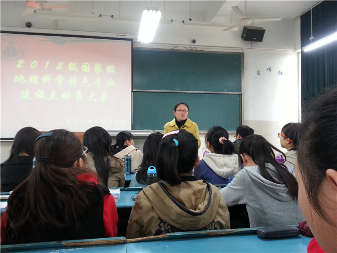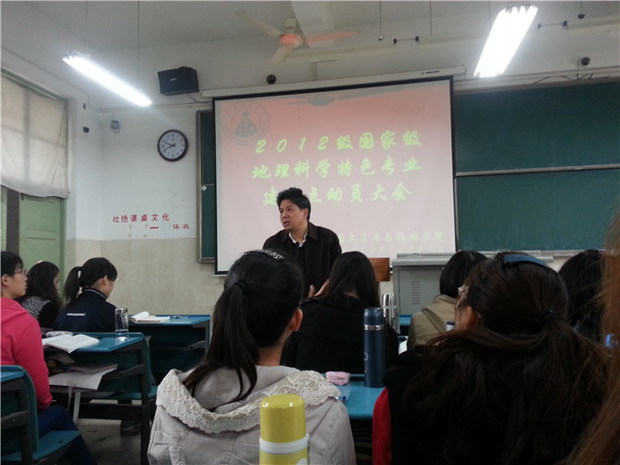 举行2012级国家级地理科学特色专业建设点动员大会,校科研处处长陆林、院教学副院长卢松、地理系主任方凤满、辅导员张玥出席本次大会,大会由卢松主持。