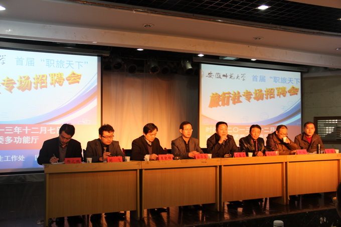 首届“职旅天下”旅行社专场招聘会。本次会议由校学生工作处主办、国旅学院承办,院党委书记吴春雷,党委副书记罗振,副院长卢松、各著名旅游企业单位总经理以及近百名师大学子参加了此次宣讲招聘会。会议由旅游系主任王朝辉教授主持。