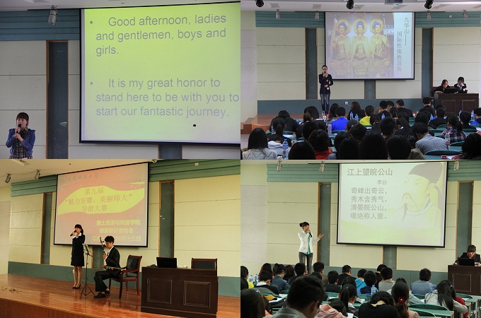 在经过全校三轮选拔之后,来自校内不同院系专业的16位同学分别以专业组与公共组参赛选手身份晋级决赛,同台竞技。本次决赛由模拟导游、才艺展示和评委点评三个环节构成。专业组选手全部来自旅游管理专业,他们意气风发,挥洒自如,侃侃而谈,充分展示出了扎实的专业功底及临场应变能力;公共组选手则紧扣自身专业或专长,凸现特色,别开生面地运用了俄语开场、天津快板串烧、全英文讲解等方式,为观摩师生带来了一场精彩纷呈,高潮迭起在赛事盛况。