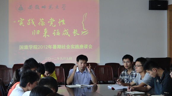 实践葆党性,归来话成长。9月5日,国旅学院2012年暑期社会实践专题座谈会在院行政楼三楼会议室举行。本次会议由院团委副书记张鑫主持,学院2012年暑期社会实践校级、院级、班级团队近60名负责人全员参与。