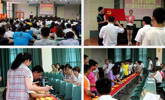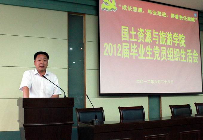 为了做好2012届毕业生文明离校工作,充分发挥学生党员的先锋模范作用,6月28日下午,国土资源与旅游学院在院实验楼101教室举行了以“成长思源,毕业思进,带着责任起航”为主题的2012届毕业生党员组织生活会。学院党委书记吴春雷、副书记罗振和相关支部书记及2012届全体毕业生党员参加本次活动。