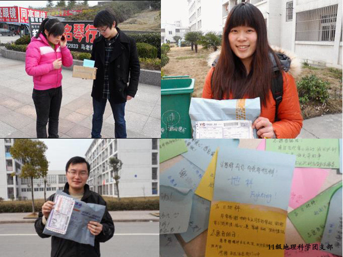 310日上午,同学们协助校内圆通快递公司整理、分拣信件,并按照相关注意事项,将每一件包裹送达至每一位收件师生。在短短一个小时时间内,送出包裹200多件,以高效优质的服务赢得了广大师生的一致好评。收到信件的同学们还纷纷写下了感动的寄语,如“感谢11地科,祝你们活动越办越好!”、“11地科,学雷锋的好榜样!”等等。