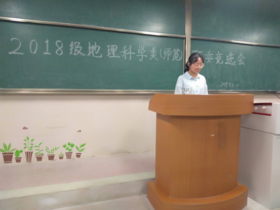 罗文菁)2018级地理学师范班是由2018级地理学一班二班部分同学共同组成的新班级,为更好的培养班级氛围,增强班级凝聚力,进行本学年班级一系列活动。2018级地理学师范班于9月5日在辅导员王阳老师的主持下展开了新学期班委竞选活动。