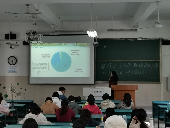 孙夏路遥)垃圾分类,从我做起。11月21日,2017级地理科学专业垃圾分类主题班会在行知楼2040303教室举行。班级全体同学参加,班长孙思主持会议。