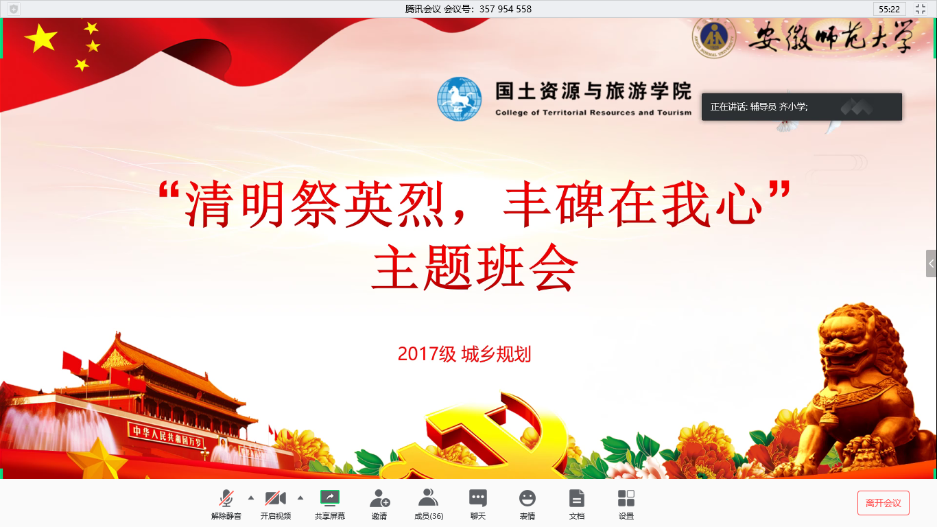 张鑫 齐小学)为缅怀抗疫烈士的英雄事迹,学习伟大的抗疫精神。4月7日晚上,2017级城乡规划于腾讯会议开展举行了“清明祭英烈,丰碑在我心”主题团日活动。辅导员齐小学、2017级城乡规划全体同学参加活动。活动由团支书鲁瑞琴主持。