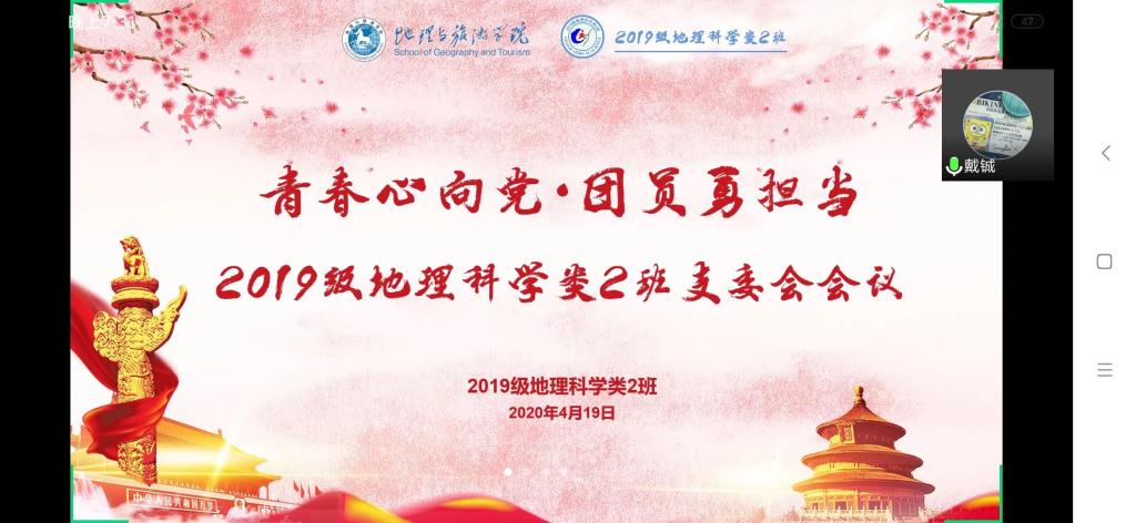 武诺 齐小学)4月19日,2019级地理科学类2班团支部召开“青春心向党,团员勇担当”主题支委会线上会议,团支部全体支委、各团小组组长参加会议。会议由团支书吴浩泽主持。