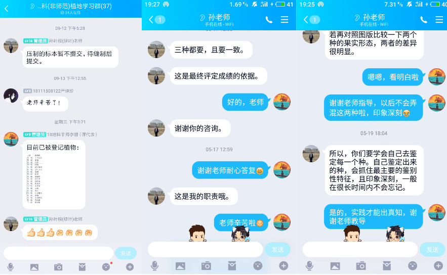 孙叶根老师受伤住院后,不顾伤痛一直坚持线上关注同学们的学习,线上指导了18地科非师范班植物地理学校园植物调查活动并届时将亲自参与线上交流汇报会点评,注重教学效果的他还计划伤情缓解后尽快开展生态学概论线下教学,如此兢兢业业的教学态度让同学们对老师肃然起敬。“纸上得来终觉浅,绝知此事要躬行”,孙老师还非常注重实践,在上学期的植物地理学教学过程中常教育同学们植物地理学是一门“田野里的科学”,在他的指导下,班级同学历时两个月相继完成或超额完成自主调查鉴定家乡所在地常见植物种类100种及数次实验报告,提高了学生独立分析问题和解决问题的能力及自主学习的综合素质。