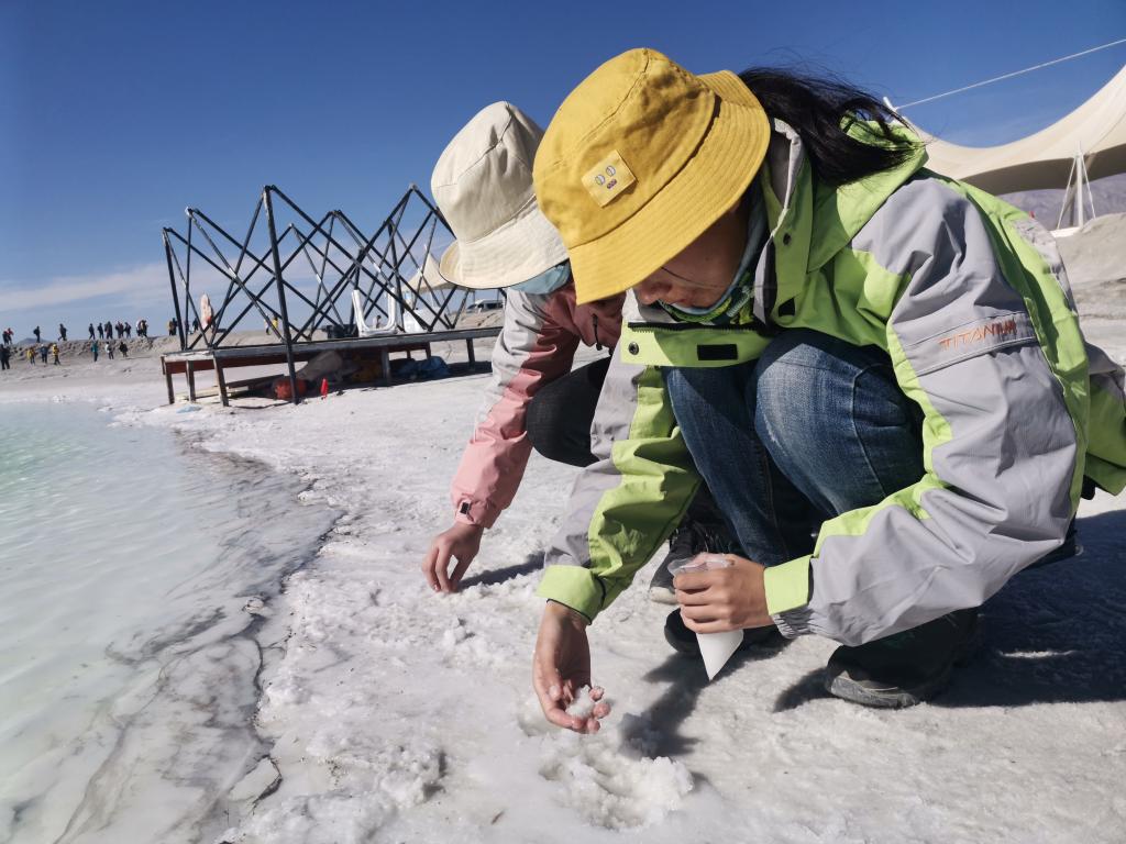 10月15日下午2时30分,团队全体成员在带队老师的带领下顺利抵达目的地——有“人间仙境”之美誉的大柴旦翡翠湖。程先富首先给同学们讲解了柴旦的含义,他指出柴旦在蒙古语中是盐湖的意思。在接下来的讲解中,同学们又了解到翡翠湖原是矿坑,位于大柴旦盐湖内部,湖水中钾、钠、镁、钙等矿物质含量较高,对阳光的散射作用使得湖水呈现翠绿色,形似翡翠,故而得名翡翠湖,又随着阳光照射角度及水深的变化,造成了湖水颜色的多变。随后程先富从地形地貌、物质来源、气候变化、河流补给四个方面向同学们阐述了盐湖在此形成的原因,并解释了此地因祁连山洪积扇扇缘地下水出露地表而形成淡水出水孔。在程先富的指导下,同学们对于翡翠湖的特征及成因有了明确的认识,意识到要严格按照水文点的考察研究方法观测盐湖湖水的相关数据特征,并及时进行样本采集。