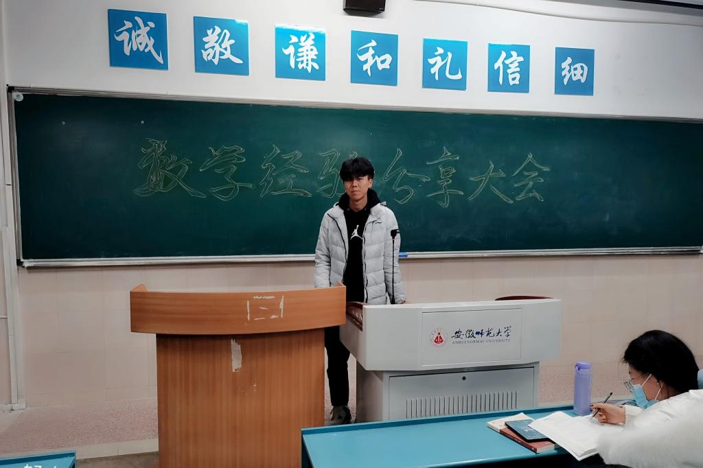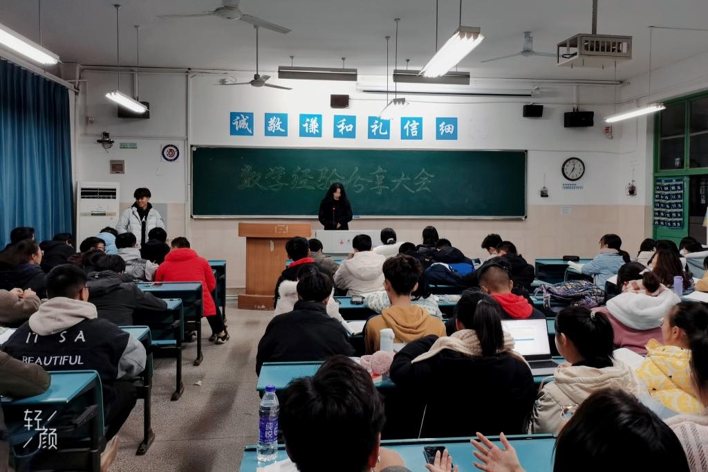 在蒋家乐简单介绍了此次分享会的背景和目的后,本次期中考试数学成绩较为优异的同学依次站上讲台分享自己的数学学习经验。首先登场的是张紫菲同学,她与大家分享了自己高数学习的“制胜法宝”,即课前充分预习、问题及时询问、利用网课资源、认真完成作业等一系列实用的学习方法,赢得了同学们阵阵掌声。其次是赵之涵同学的经验分享,赵之涵同学从“抓住课堂”、“坚持学习”、“作业独立完成”、“做适合自己的笔记”等角度与同学们分享自己高数成绩取得满分的方法和技巧。