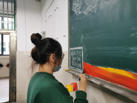 11月23日下午到达教室后,同学们首先对旧的板报进行了清理,两位男同学搬来长椅,方便清理,清洁工作有条不紊地开展了。随后,同学们在干燥的黑板上开始用粉笔规划图片与文字布局,并进行了区域分工。紧接着,按照安排好的分工,同学们先在黑板上画出了底稿。在王佳懿同学的调色和指导下,同学们开始分工用颜料填色。期间,班长吕聿炀同学,丁瑞欣同学及马加星同学前来帮忙,大大加快了工作进度。下午五点左右,所有的图片填色工作已经完成,前期绘图工作告一段落。