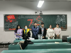 2019级旅游管理专业板报小组成员在行知楼2030404教室组织“纪念中国人民志愿军抗美援朝出国作战70周年”主题板报绘画。王佳懿、黄梦雪、袁娜、方菲菲、林兴华、凡语馨、刘鋆浩、王欣八位同学参与了设计绘画。