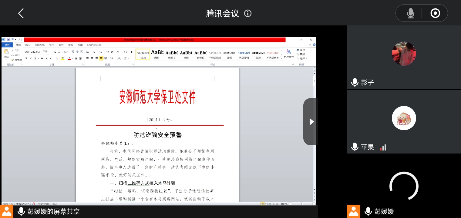 本网讯 (廖琴 黄睿卿 彭媛媛)为提高同学们安全意识,增强防骗能力,4月28日,2020级地理科学类、地理科学(拔尖班)在腾讯会议平台召开防范诈骗安全预警线上主题班会,会议由辅导员彭媛媛老师主持,2020级地理科学类、地理科学(拔尖班)全体同学参加。