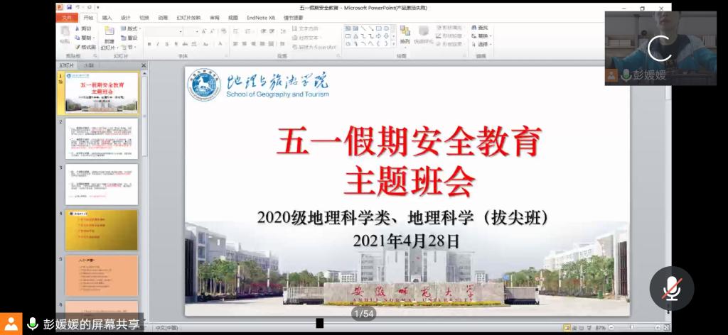 本网讯(刘思圻 彭媛媛)五一假期临近,为进一步增强同学们的安全意识,加强假期安全教育, 2021年4月28日,2020级地理科学类、地理科学(拔尖班)召开五一假期安全教育线上主题班会,会议由辅导员彭媛媛主持,2020级地理科学类、地理科学(拔尖班)全体同学参与。