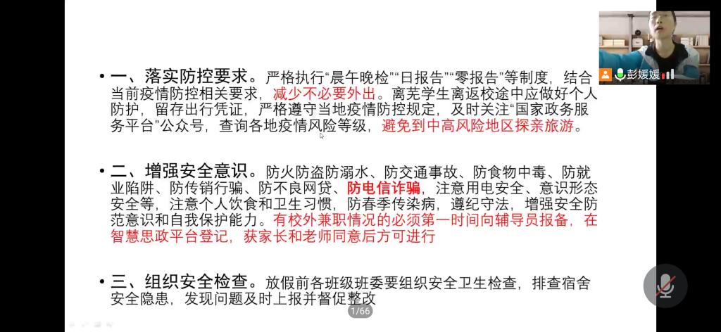 会议首先强调了假期期间疫情防控工作,由于同学们在假期期间返乡回家,人流量大,更要每天坚持晨午晚体温测量,做好疫情防护,坚持每日健康打卡。假期离校学生要严格履行离校登记制度,并让家长发离校核实短信,假期保持手机畅通。此外,彭媛媛还叮嘱同学假期出行一定要注意交通安全、防火防盗防溺水、防食物中毒、防就业陷阱、防传销行骗、防不良网贷、防电信诈骗,注意用电安全等,注意个人饮食和卫生习惯,防春季传染病,遵纪守法,增强安全防范意识和自我保护能力。有校外兼职情况的必须第一时间向辅导员报备,在智慧思政平台登记,获家长和老师同意后方可进行。