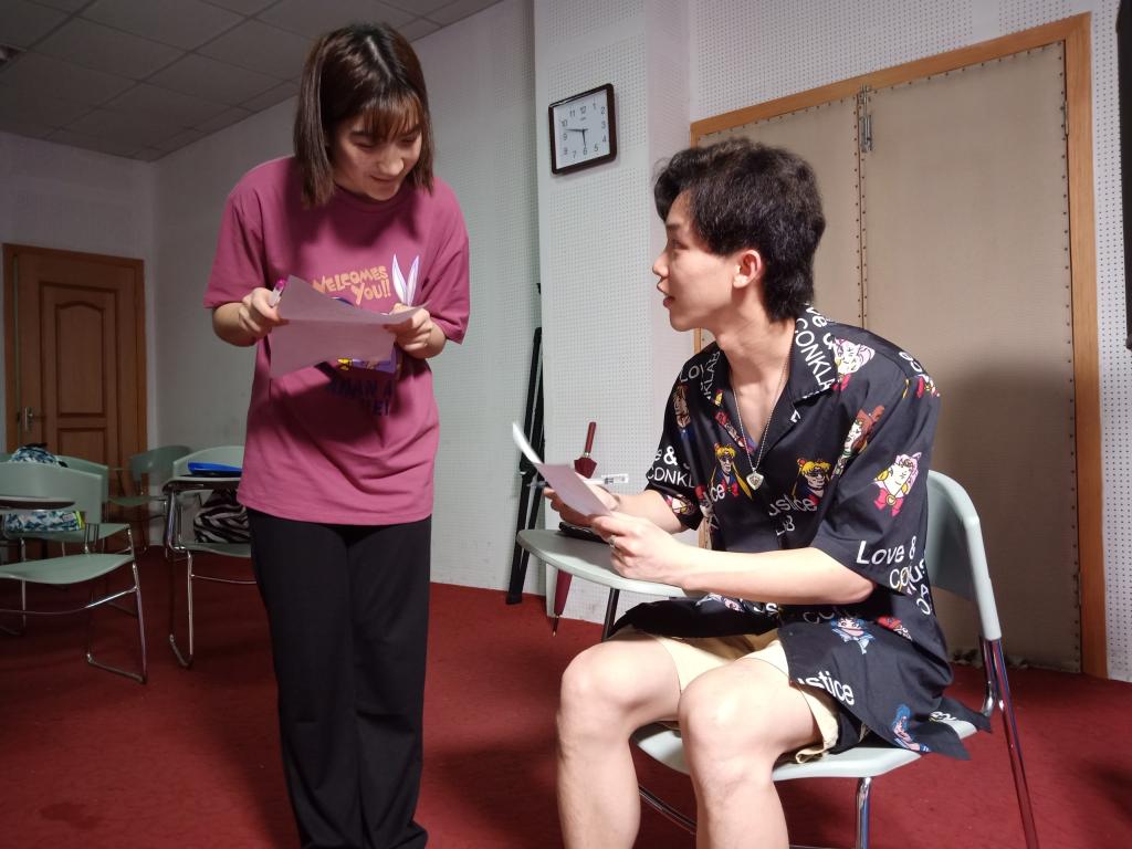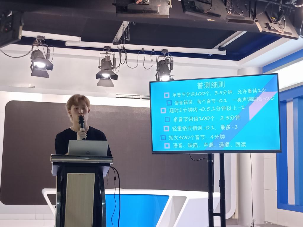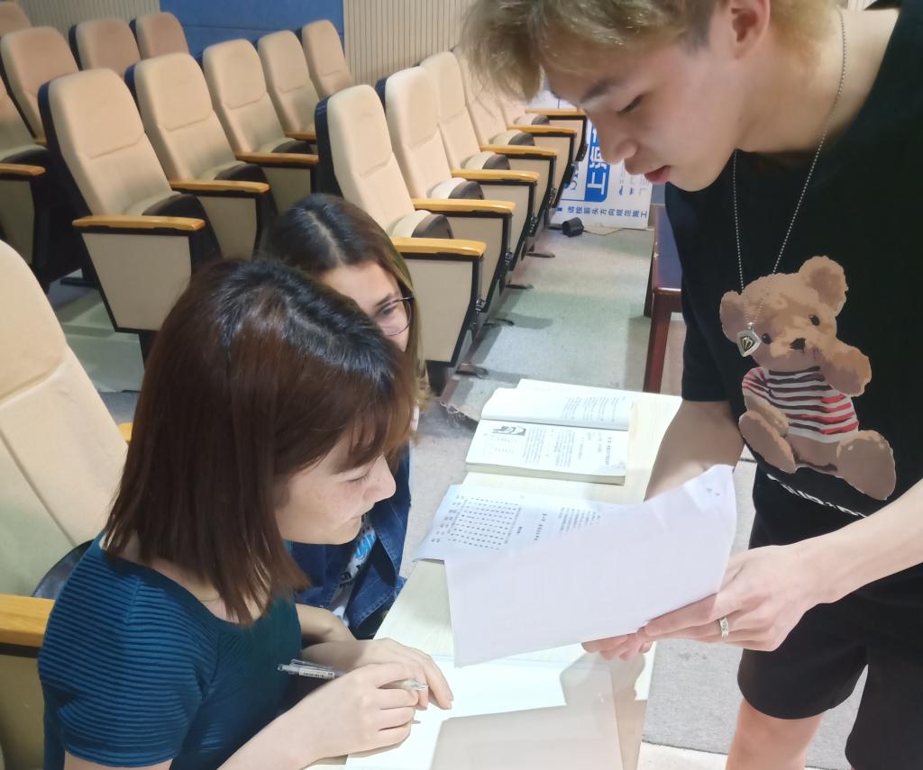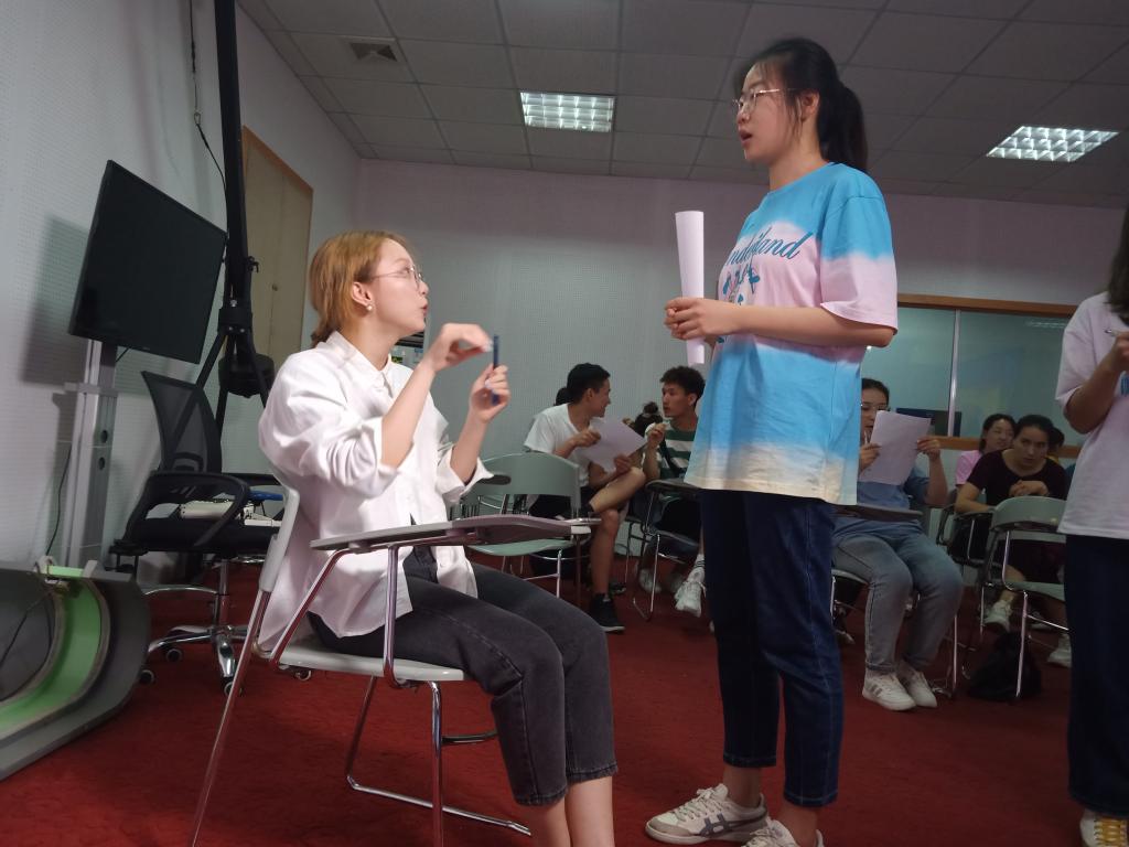 接着两次的普通话实践教学课由章海钰、普通话协会会长李璇以及2018级播音主持与艺术专业班长张尊贤一起负责。首先,他们向同学们分发了相关的学习资料,供同学们学习练习。随后,他们让大家先自己练,再一个一个找老师读。每位同学都以十分认真的态度对待此次热身练习,在手机上先查好正确的读法,再和自己附近的伙伴一起相互练习,相互指正,练习完毕后陆续找老师读,再根据老师指出的问题进行针对性的练习。第二次课后,章海钰给同学们布置了第一次的课后作业,要求同学们利用空闲时间看一则短新闻,跟着主持人的发音一起练习,这样将更有利于大家练习和纠正声调和声高不准的问题。课上,李璇带着大家练习了平舌翘舌,前鼻音后鼻音,并一一指出了大家发音时存在的问题,重点强调要进行针对性的、对症下药的练习。