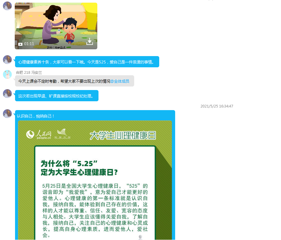 5月25日,辅导员张慧在班群中分享了有关心理健康的视频和图片,倡导大家积极学习相关知识,更好爱自己、爱他人、爱社会。当晚,张慧还深入学生寝室,与心理委员吴净对同学们进行心理辅导交流。张慧向同学们科普了“5·25”全国大学生心理健康日的由来,并举例说明了心理健康问题来临的偶然性以及可能造成的严重后果,告诫大家要有心理健康危机意识。当心情郁闷、焦虑、抑郁时,大家要判断是否是短期的,如果是短期的,一般来说很正常,但也需要通过自我放松和向他人倾诉来解压;如果是长期的,需要格外重视,并主动向心理委员、辅导员、家人朋友、心理健康中心老师寻求帮助。她号召大家学会爱自己,在此基础上关心他人,适当伸出援手。此外,张慧还建议大家养成早睡早起、合理饮食、积极锻炼的生活习惯,并回答了伍丽瑾关于长时间学习而眼睛疼的释压方式。