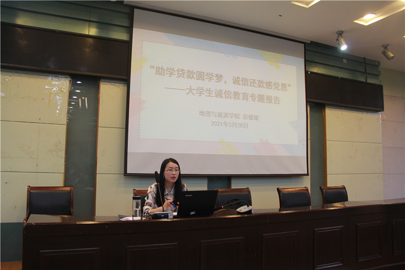 在实验楼101教室开展资助诚信教育系列活动,活动由学院分管学生资助工作的辅导员彭媛媛主持,全体申请助学贷款的学生、各年级各班级家庭经济困难学生代表参会。