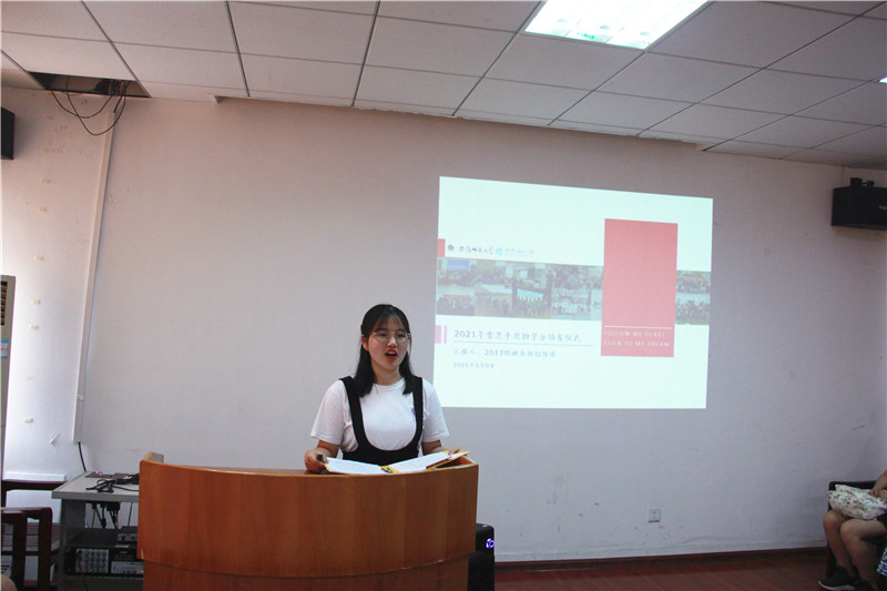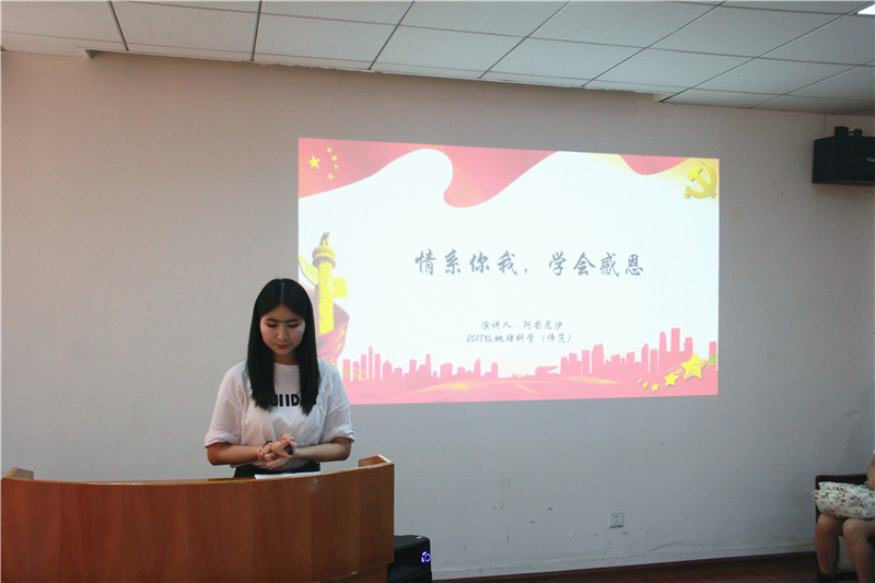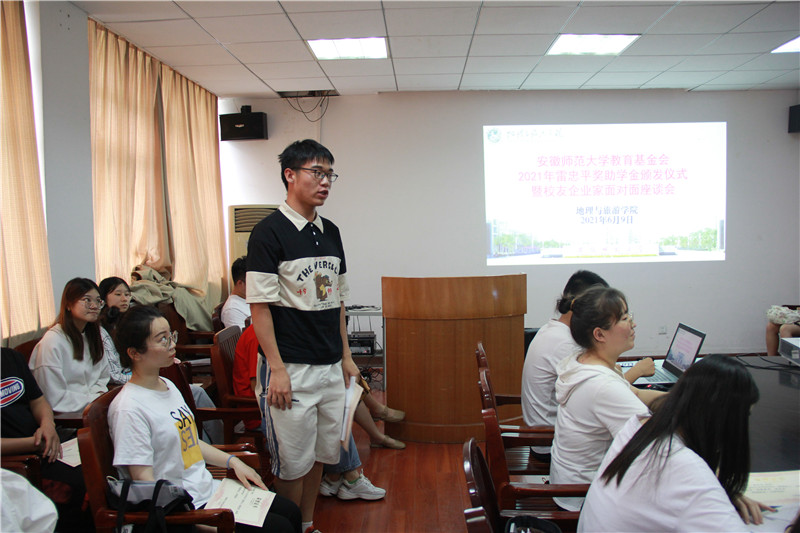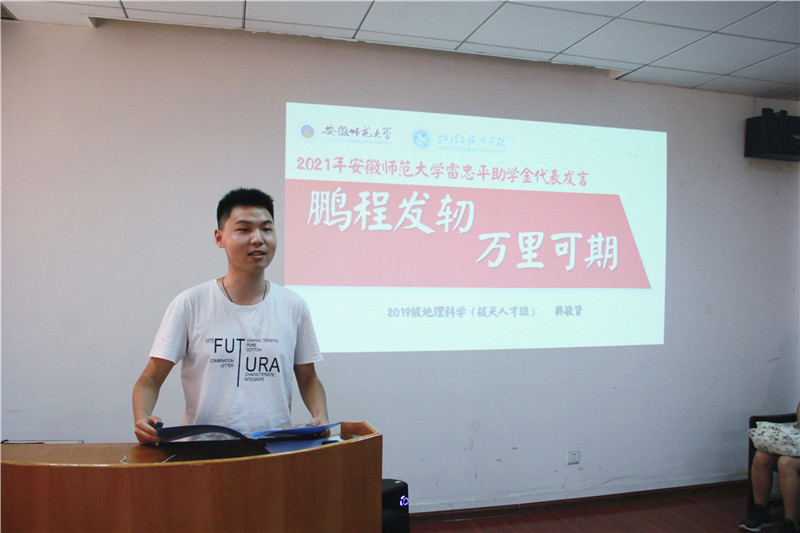2017级城乡规划专业陈诺、2018级地科师范专业阿芒尼沙去•依来克、2019级地理拔尖班樊敬贤和2018级地科师范专业胡玉乾作为获奖受助学生代表分享了自己的成长历程,对雷忠平先生的捐资助学表示感谢,并立志在以后的学习生活中,将这份帮助和善意传递下去,以实际行动回馈社会、报效国家,做对社会有用的人。