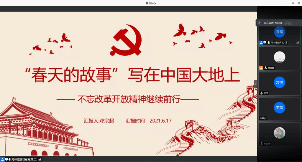 孙文灿 彭媛媛)为进一步做好党史学习教育,引领广大青年团员从党史学习中激发信仰、获得启发、汲取力量,2020级地理科学类专业一班团支部于6月17日晚19:30开展“学党史、强信念、跟党走”学习教育改革开放专题学习主题团日活动。本次专题学习会以支部大会的形式召开,同时结合新媒体技术在线上开展,由团支书孙文灿主持,组织委员邓宗超主讲,2020级地理科学类专业一班全体学生参加。