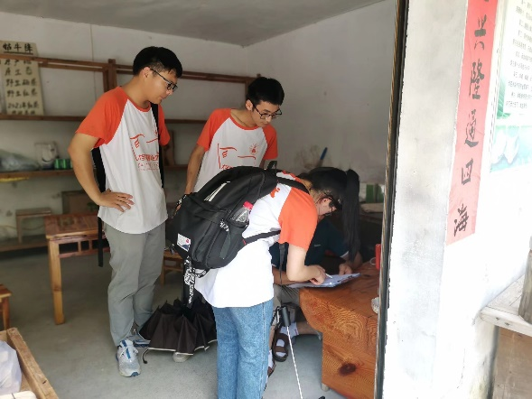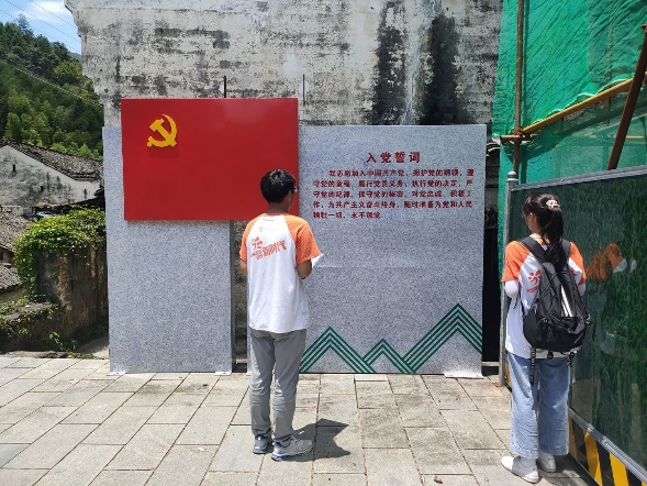同学们清晨迎着朝阳出发,向着牯牛降景区迈进,对昨日调研路线进一步开拓。调研组的同学们沿着牯牛降景区的环状游步道,两两结对分布在景区各处,对来往游客、当地居民以及工作人员进行问卷调研以及当面访谈。同时团队成员前往严家古村瞻仰革命遗址,在新民主主义革命时期,红军在牯牛降山脚下的严家古村设立兵工厂。抗日战争爆发后,北上抗日先遣队在此驻扎,播下了革命的火种,先后有数十人参加了各种抗日组织,帮助掩护抗日部队,村中共有7位革命烈士。团队成员在村落前的石碑上庄严诵读入党誓词,让我们再次领略到党的伟大。探访严家古村,只是调研活动的一个小插曲,但是却让团队成员领略到中国共产党与人民为新中国的建立与建设付出的巨大努力与牺牲。