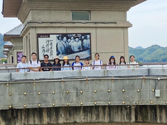 到达金寨后,实践调研团队乘坐大巴去往梅山水库。梅山水库坐落在史河上游梅山城区,是淮河流域重点工程,是由我国自行设计自行施工的当时世界上最高的连拱坝,坝高88.24米,全长443.5米。大坝雄伟壮观,气势磅礴,犹如长虹卧波横跨在高峡平湖之中。梅山水库是具有防洪、灌溉、发电、航运与水产养殖等综合利用功能的大型水利枢纽工程。此外,由于水库的修建,人工湖随之形成。库区湖光山色,林壑尤美,醇厚的民风、秀丽的景色和美好的传说,吸引着无数中外游客前来观光游览。梅山水库景区丰富的"绿色"旅游资源同县域“红色”革命传统紧密相联,形成了自己独特的旅游文化。新中国成立后,淮河流域水灾严重,连年的洪水对当地百姓的生产生活产生了很大影响。当时就流传着这样一句话,“走千走万,不如走淮河两岸”,这也表明了当地百姓受到洪水的严重影响。这也受到了党中央的高度重视。在皖西流域修建了五座大坝,梅山大坝就是其中之一。调研团队在参观水库时,还看到了毛泽东主席曾说过的“一定要把淮河修好的”标语。不禁感叹重大水利工程对人民群众生命和财产安全的巨大作用,也表达了对水库建设者的崇敬之情。