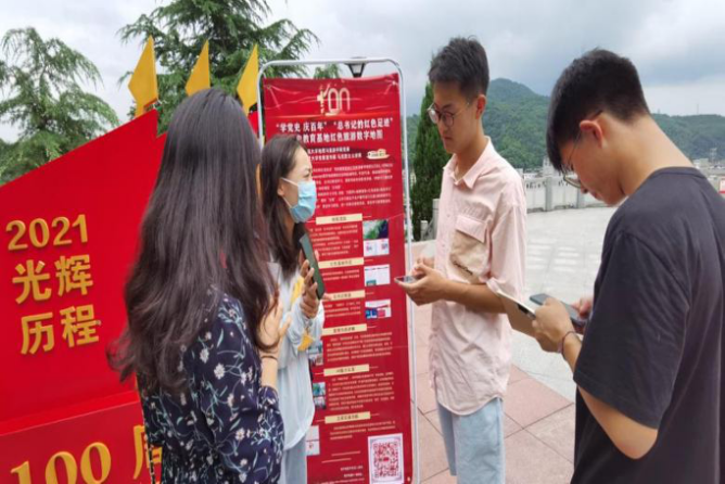 实践团队成员为进一步做好党史宣传工作,在红军广场向游客展开宣讲。通过数字地图这一载体,党史不在只是存在于书中的文字。通过与现代科技的融合,党史“活”了起来。通过VR虚拟现实技术,使用者可以足不出户就能够有身临其境的真实感受,让党史的学习变的更有趣味性。团队成员耐心的向游客介绍数字地图的丰富功能和使用方法,很多游客对数字地图赞不绝口,这也更加坚定了团队成员继续宣传党史的信心。