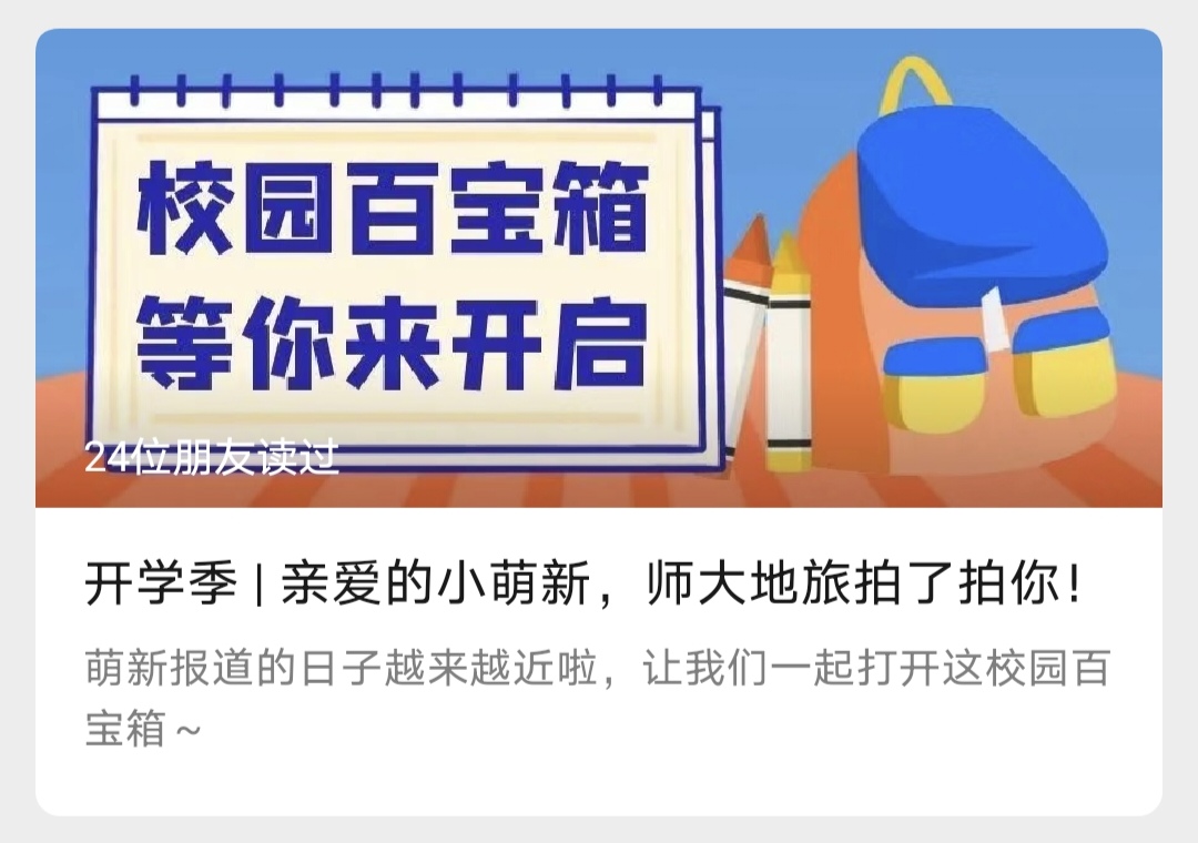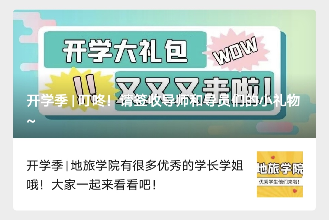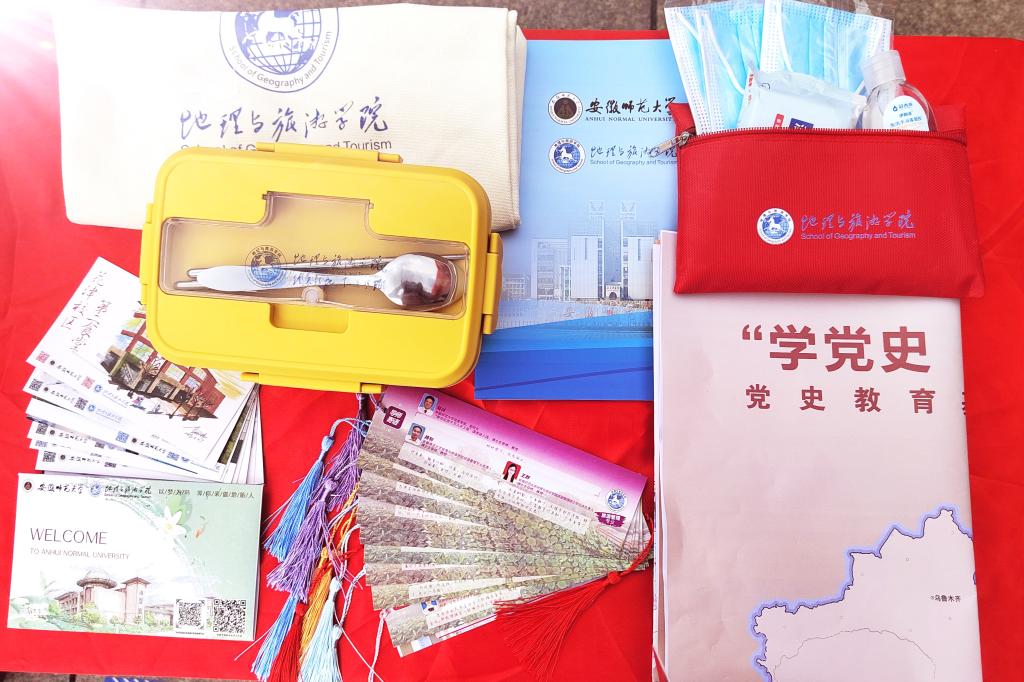 新生的热烈欢迎,学院精心准备了丰厚的“新生大礼包”,包含“线下”和“线上”两部分: “线下大礼包”为“地旅暖心七件套”,分别是学院定制LOGO及院训的入学纪念帆布袋、防疫环保分餐制饭盒、装有口罩、酒精消毒湿巾、免洗手消毒凝胶、定制红色便携包的防疫包、城乡规划专业特色手绘师大风景明信片、导师推荐阅读书目和新生寄语的定制书签一套、学院师生自主研发的“总书记的红色足迹”数字地图一幅、院史院情介绍手册;“线上大礼包”通过青春地旅微信公众号推送,共三部分:一是涵盖“入学须知”、“防疫知识”“校园卡使用”、“安全提醒”等内容丰富的新生“电子大礼包”;二是国产精品