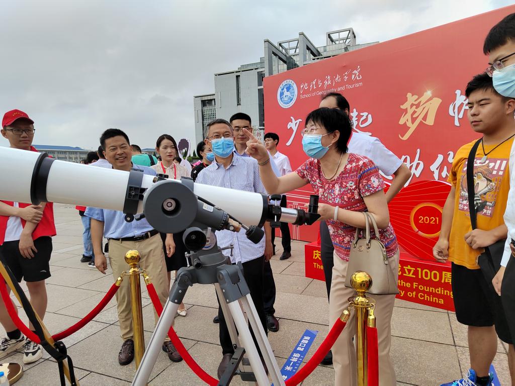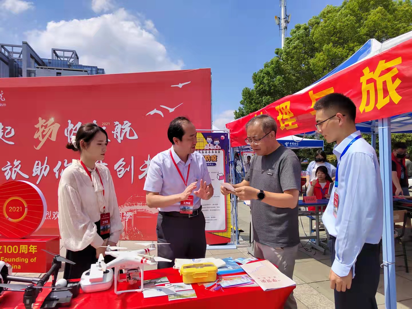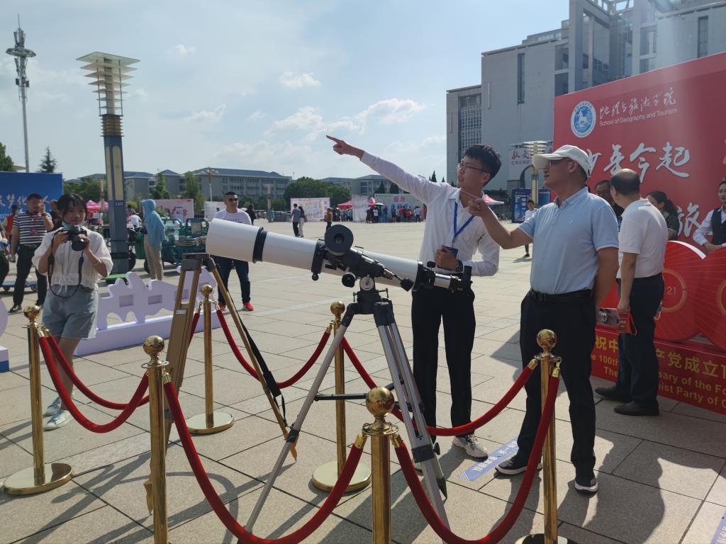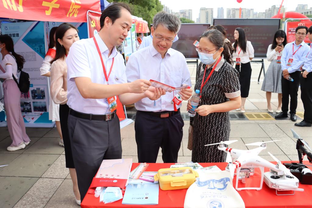 各专业特色。专业设备的展示包含天文望远镜、测量仪、无人机等,天文望远镜引来新生和家长的驻足观看和尝试;无人机实时拍摄转播校园迎新报到当天盛况。视屏展示包含校园风景航拍视频讲解,帮助新生和家长直观立体地了解校园空间格局;学院师生自主研发的“总书记的红色足迹”数字地图展示通过雷锋导游讲解、VR实景拍摄,让新生和家长现场体验在线红色旅游和党史教育;国产精品