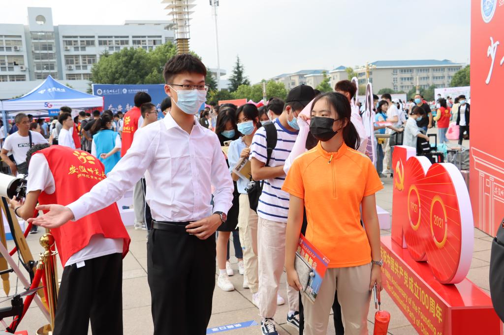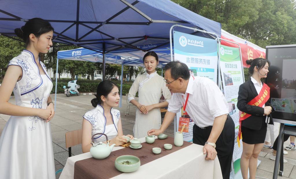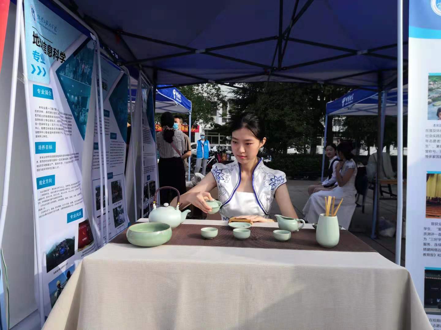 定制拍照手牌、结合建党百年定制红色迎新喷绘、引导加长学生拍照留念。茶艺表演通过学生现场茶艺展示,向同学们传达了传统的中国茶文化和国产精品