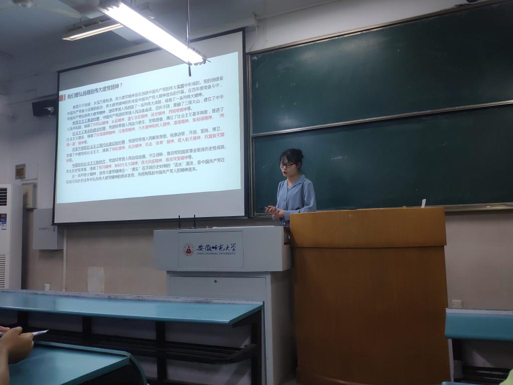 学习重要讲话,领悟伟大精神。张慧播放了MV《百年正青春》,同学们在精心制作的视频里感受了跨越世纪的激荡历史,在青春昂扬的歌声里体会到青春正当时的奋发之情。随后,班级同学在张慧的带领下,认真学习了习近平总书记“七一”重要讲话精神,重点体悟了伟大建党精神是中国共产党的精神之源——“坚持真理,坚守理想”、“践行初心、担当使命”、“不怕牺牲,英勇斗争”、“对党忠诚、不负人民”。她进一步指出,“人无精神则不立,国无精神则不强。”伟大建党精神是从实践中产生的,作为新时代青年大学生,我们需要理解学习不同时代背景下的精神内涵,做到学党史、知党情、颂党恩、跟党走,弘扬建党精神,争做时代先锋。