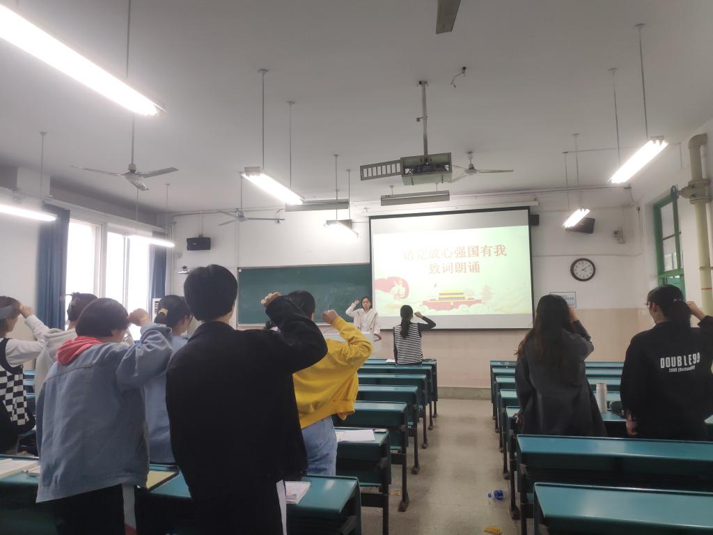 活动伊始,团支书韩雨彤带领同学们深入学习了习近平总书记“七一”重要讲话精神,号召班级同学把青春奋斗融入党和人民事业,以实现中华民族伟大复兴为己任,立志成为实现中华民族伟大复兴的先锋力量。随后,团支书韩雨彤带领同学们学习了习近平总书记在纪念辛亥革命110周年大会重要讲话内容,一同缅怀孙中山先生等革命先驱的历史功勋,学习和弘扬他们为振兴中华而矢志不渝的崇高精神,努力为实现中华民族伟大复兴而共同奋斗。最后,在团支书韩雨彤的组织下,班级同学共同进行“请党放心,强国有我”致词朗诵,向党致以青春的礼赞,对党许下青春的誓言!