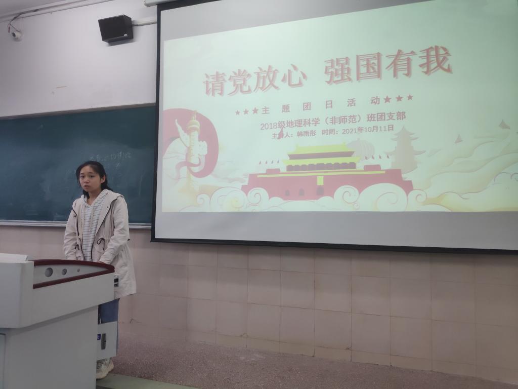 李娜)为深入学习贯彻习近平总书记“七一”重要讲话精神及习近平总书记在纪念辛亥革命110周年大会上的重要讲话精神,将学习体会与成果内化于心外化于行,2021年10月11日下午四点,2018级地理科学(非师范)专业“请党放心 强国有我”主题团日活动在行知楼4号楼504教室顺利举行。团日活动由团支书韩雨彤主持,2018级地理科学(非师范)专业全体同学参加。