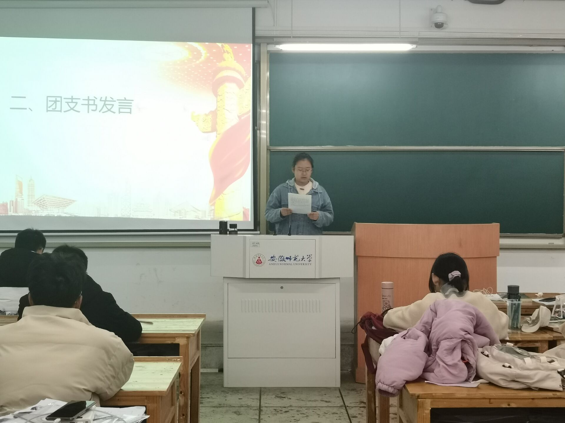 大会开始,全体同学起立共唱团歌。然后,团支书李婷向支部汇报开展党史学习教育、团组织生活、主题团日活动,以及班级成员在活动中的收获与感悟,鼓励大家作为新时代新青年应有所作为、积极作为,自觉担当民族大任,并提出团员青年要加强党团知识学习、参与团的建设,积极配合团支部工作,塑造出一个朝气蓬勃、激情昂扬的班集体和团支部。
