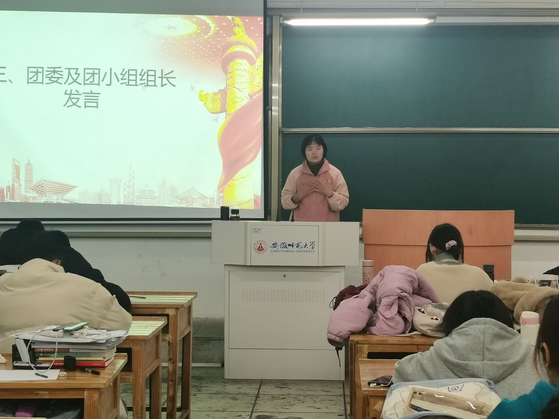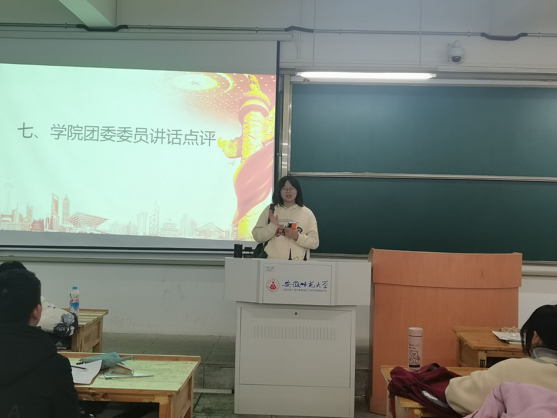 全体同学共同重温入团誓词之后,院团委组织委员周咏恬总结点评,过程中强调作为学生群众也应端正态度、积极向团组织靠拢,主动投身团组织活动。团员、党员身份只是一个象征,更加重要的是一个人对于党、对于国家的热爱和奉献之心,只要大家向党爱国、努力学习、投身奉献,就一定能得到党和国家的认可。