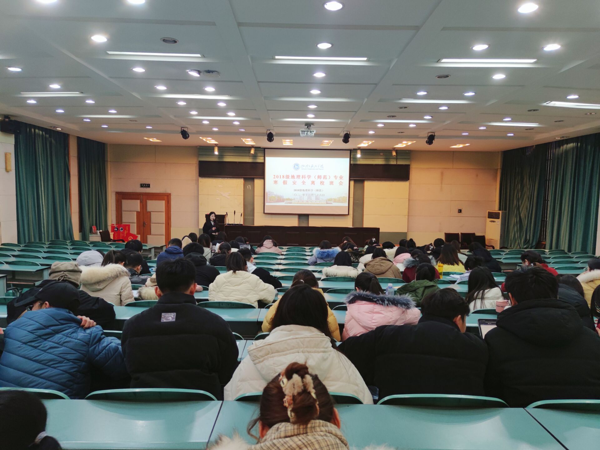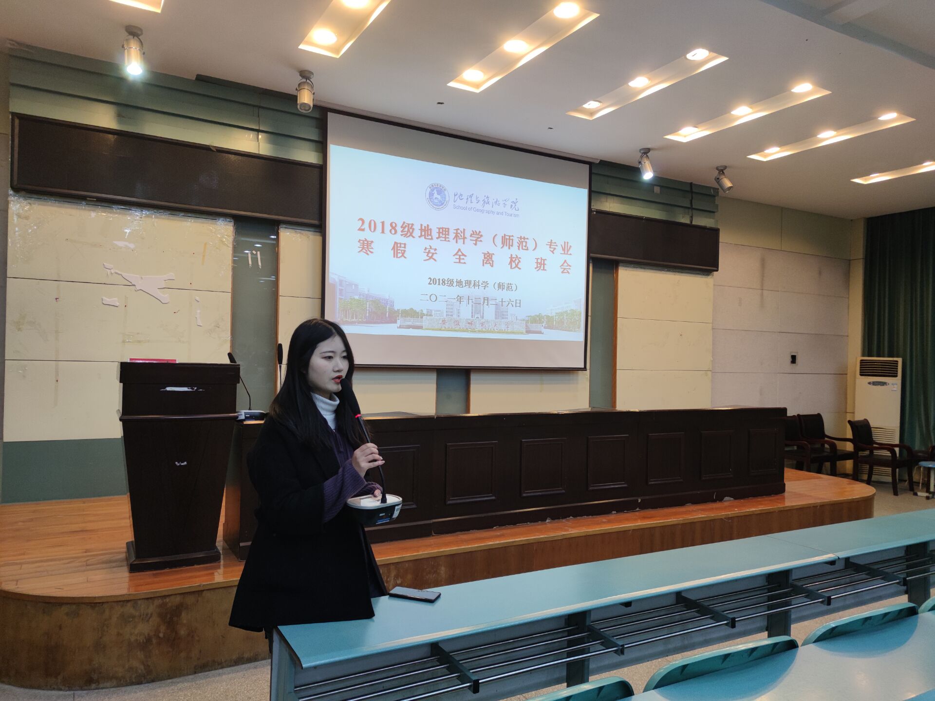 实验楼101教室召开寒假安全离校主题班会。2018级地理科学(师范)专业全体学生参与本次会议,班会由辅导员丁茹栩主持。