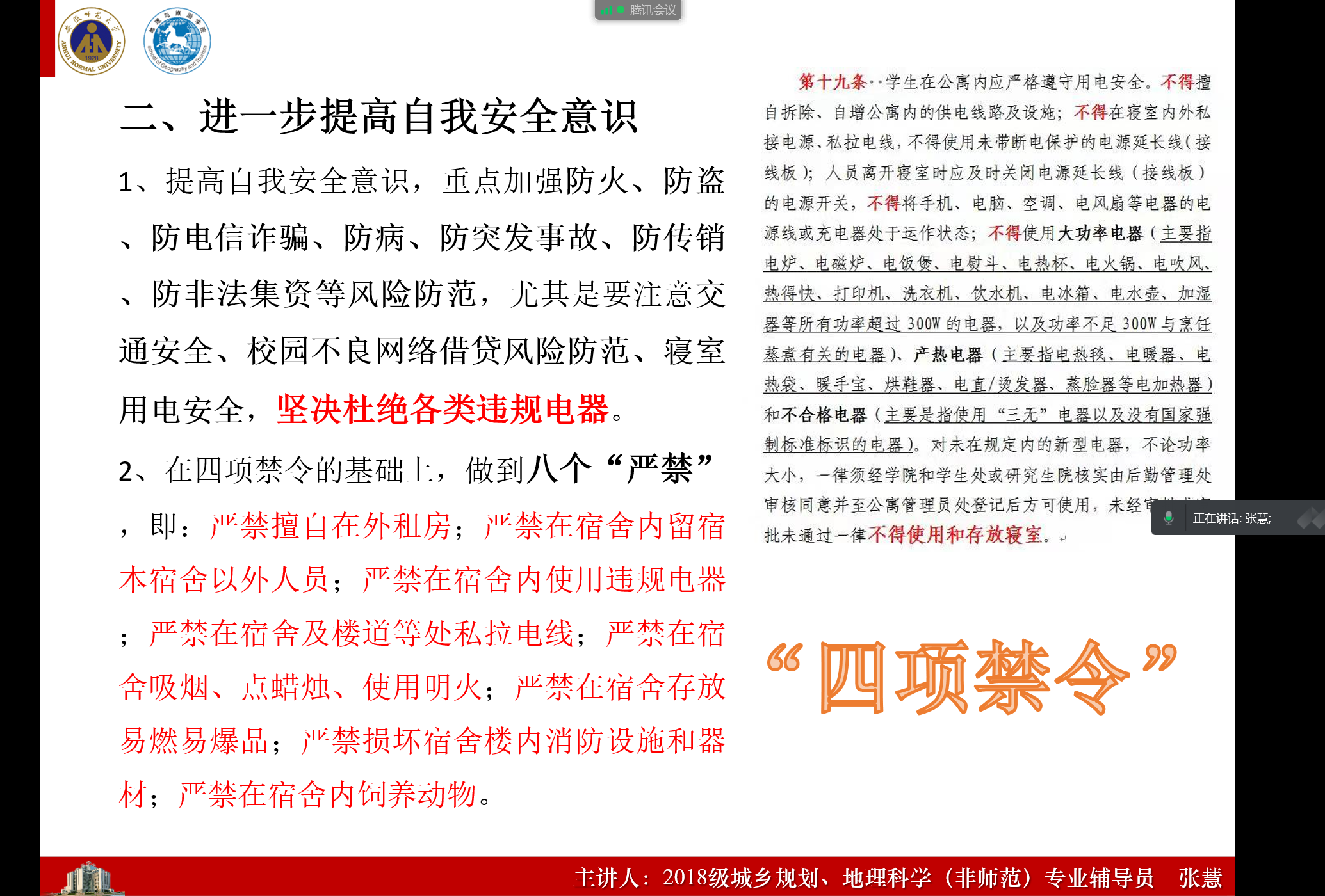 (本网讯 张慧)为做好期末安全教育,增强学生安全防范意识,12月27日晚上7点,2018级城乡规划及地理科学(非师范)专业在腾讯会议室召开期末安全教育及放假提醒主题班会。会议由辅导员张慧主持,2018级城乡规划及地理科学(非师范)专业全体同学参与会议。