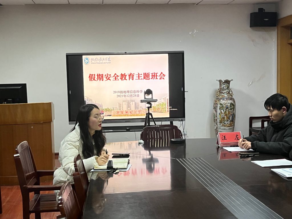 为提高同学们寝室安全意识,树立正确考研心态,并通知毕业生参军入伍相关事项,2018级地理信息科学专业在2021年12月28日晚上18:00于院行政楼三楼会议室开展假期安全教育主题班会,会议由辅导员彭媛媛主持, 2018级地理信息科学专业全体同学参与。