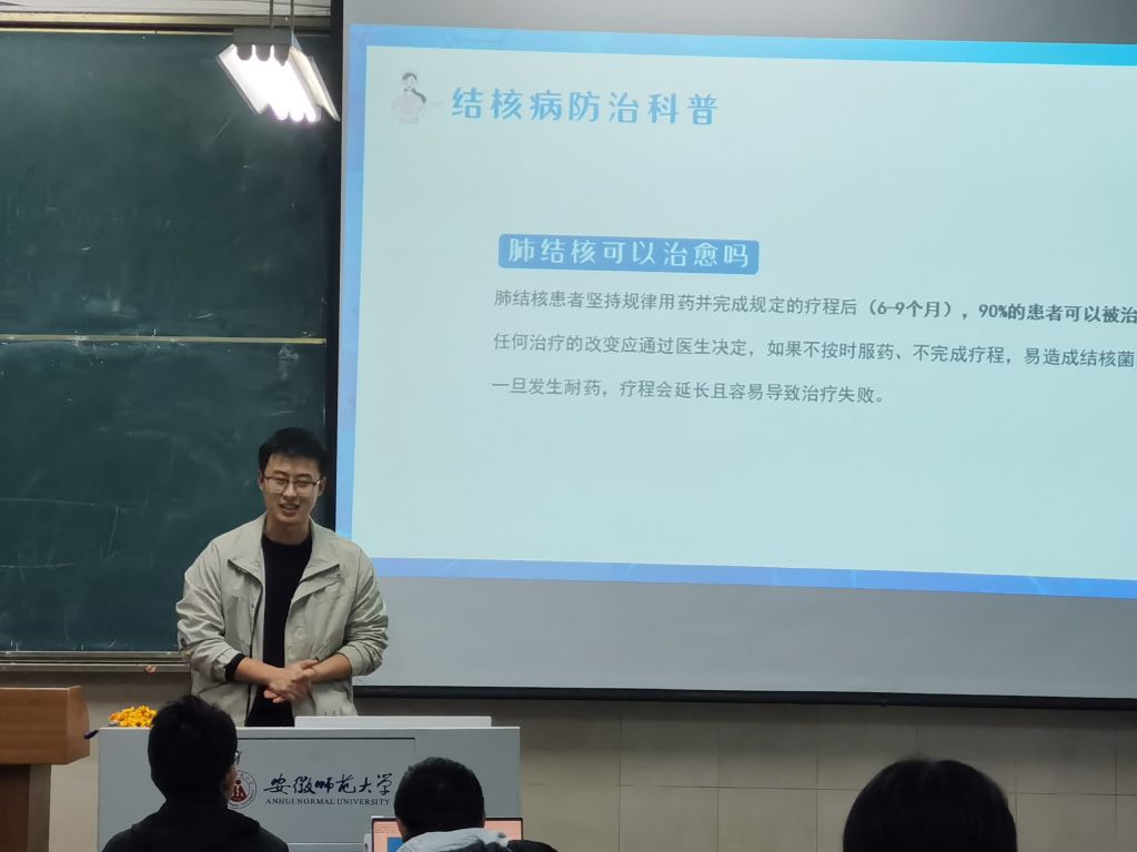 3月24日是世界防治结核病日,班会开始韩东杰先向同学们简单地介绍了防结核病日的重要意义以及结核病的概念。为了让同学们进一步了解肺结核,韩东杰为大家播放了肺结核疾病科普视频,通过视频同学们了解到肺结核是一种由结核分枝杆菌感染引起的呼吸系统传染病,在我国古代便有"肺痨"这一说,它的易感人群主要包括HIV感染者、糖尿病患者、老年人等免疫力低下的人群。为早预防肺结核疾病,建议每年定期进行结核病检查。看完视频后,韩东杰进行补充性的科普讲解,同学们逐渐对防结核病有了更深入的认知,对保持身体健康的意识也进一步加强。